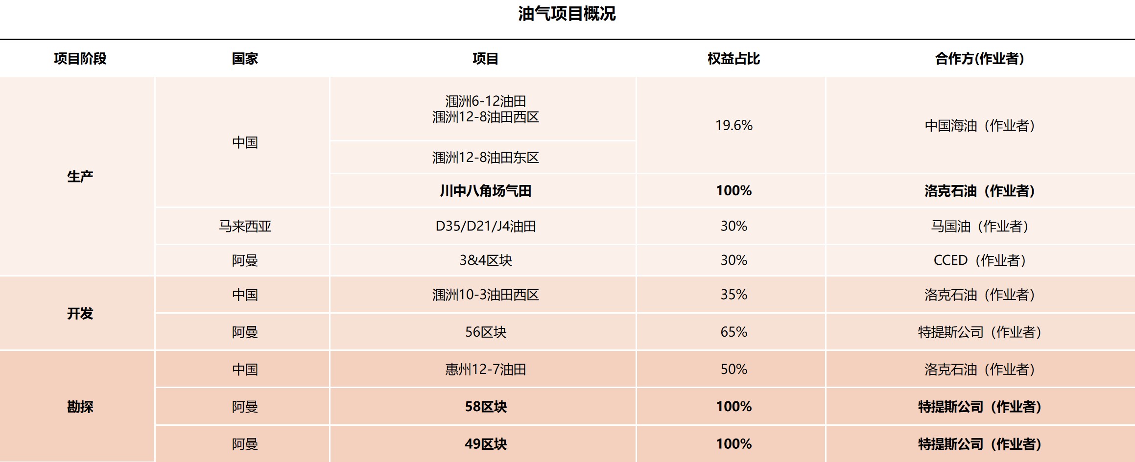 目前主要油氣項(xiàng)目位于中國四川、南海西部北部灣、南海東部珠江口、馬來西亞以及阿曼等地,目前日均油氣產(chǎn)量35000桶當(dāng)量。